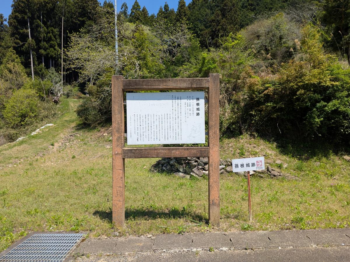 県道大沼足助線の脇にたつ孫根城跡の解説看板と、城跡までのルート上にある春日神社。分かれ道付近には、矢印看板が設置されているので安心です。
