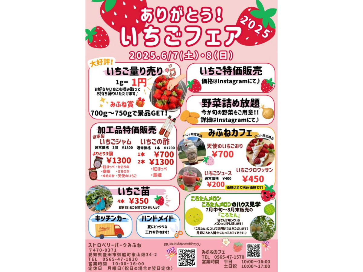 | 電話番号 | 0565-47-1830(ストロベリーパークみふね) 0565-47-1570(みふねカフェ) |