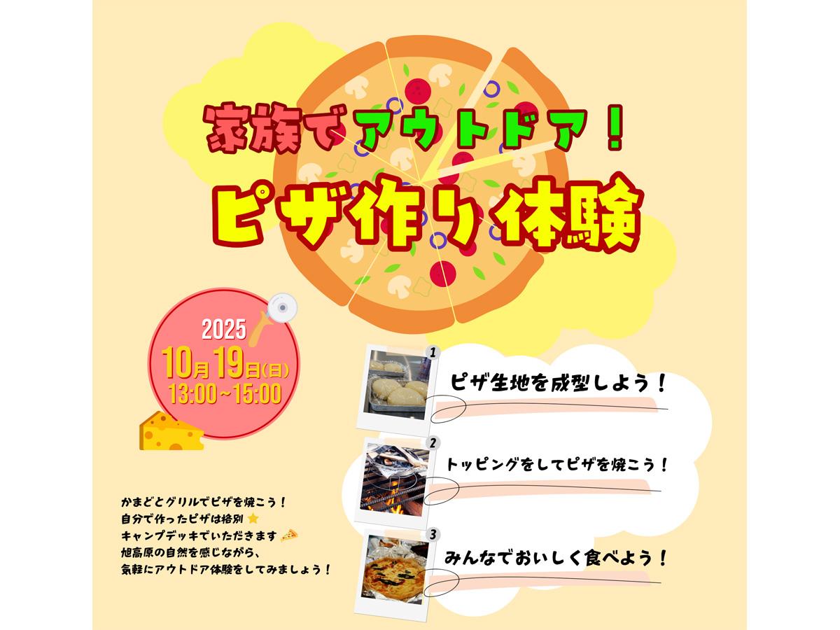 ピザ生地を成型しトッピング、かまどとグリルでピザを焼きます。キャップデッキに移動して旭高原の自然を感じながらいただきます!包丁を使う作業や火起こし等の難しい作業は一切無し!