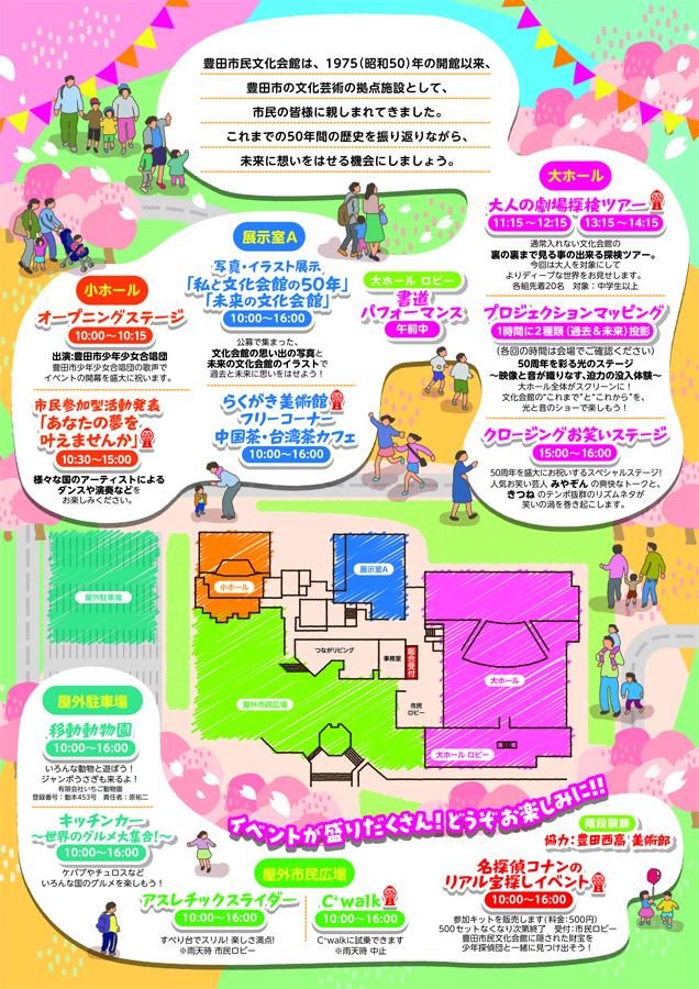 豊田市民文化会館は、1975(昭和50)年の開館以来、豊田市の文化芸術の拠点施設として市民の皆様に親しまれ、今年度開館50周年を迎えます。これまでの50年間の歴史を振り返りながら、未来に想いを馳せる機会を作りたく、豊田市民文化会館全域で様々なイベントを開催します。ご家族揃ってお楽しみください。