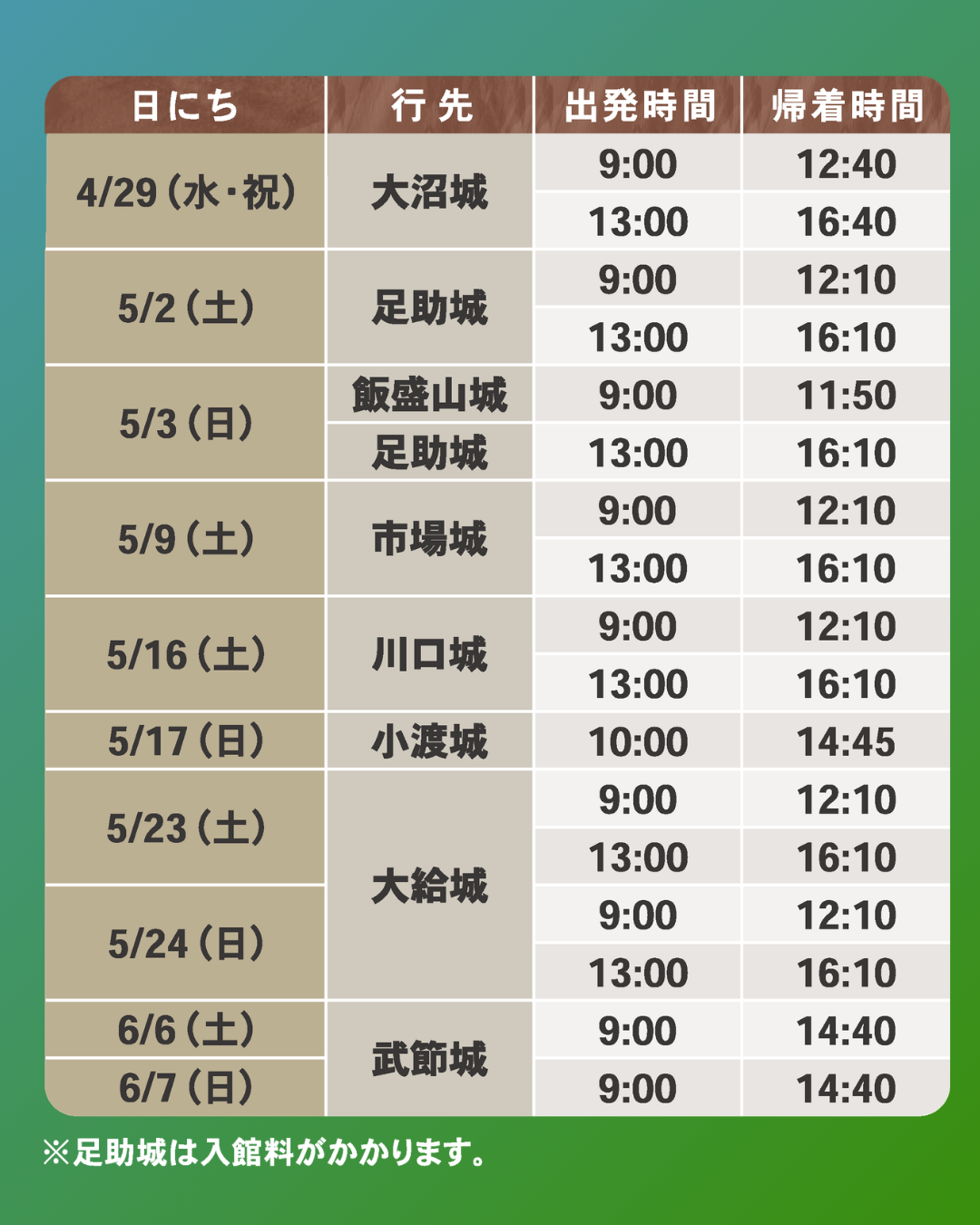| 開催時期 | 大沼城:2026年4月29日(水・祝) 足助城:2026年5月2日(土)、5月3日(日・祝) 飯盛山城:2026年5月3日(日) 市場城:2026年5月9日(土) 川口城:2026年5月16日(土) 小渡城:2026年5月17日(日) 大給城:2026年5月23日(土)、5月24日(日) 武節城:2026年6月6日(土)、6月7日(日) ※天候等のやむを得ない事情により中止する場合があります。 |