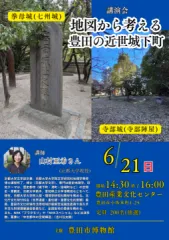 豊田市博物館の企画展「教えて、千田先生! とよたの城も天下の城も」の開催に合わせて、山村亜希氏の講演会が豊田産業文化センターにて開催されます。近世の豊田市には、複数の城や陣屋が建てられ、その周りに城下町が形成されていました。その中でも現在の市の中心部にある挙母城(桜城・七州城)と寺部陣屋(寺部城)の城下町について、地図や資料からその特徴についてお話しいただきます。