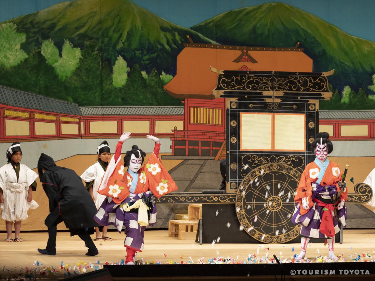 江戸時代中期、神社に奉納する地芝居として始まった小原歌舞伎は、農村の数少ない娯楽、地域芸能として地域各地に広まり、小原歌舞伎保存会の人たちにより現在に受け継がれています。