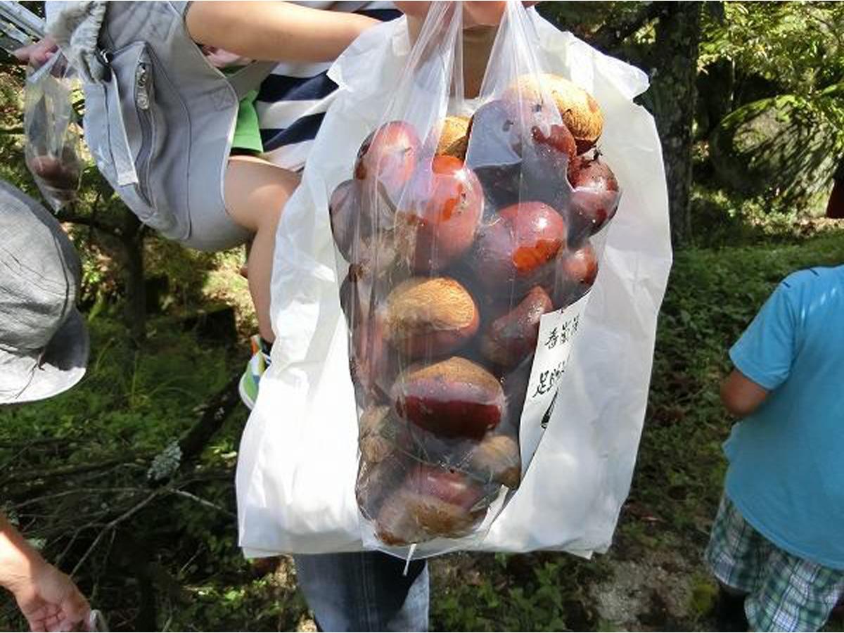 (6)入山出入口にて栗拾い用の袋をもらいます。入山後、栗拾いをお楽しみください。