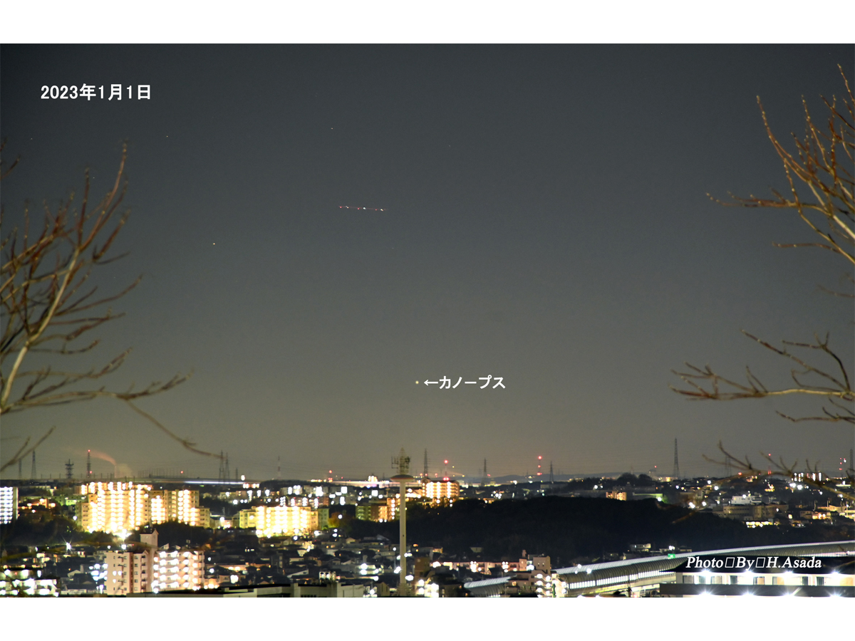 全天で最も明るい恒星、おおいぬ座のシリウスが南中する20分ほど前に、シリウスに次いで2番目に明るい恒星、りゅうこつ座のカノープスが、南の地平線わずか3°の地平線スレスレのところに顔を出す。
