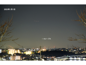 このカノープスが、東海地方ではちょうど大晦日の新年を迎える23時40分ごろに南中する。このおめでたい星を、除夜の鐘を聞きながら拝むことができたら、きっと迎える年は平和で健康な1年になるだろう。