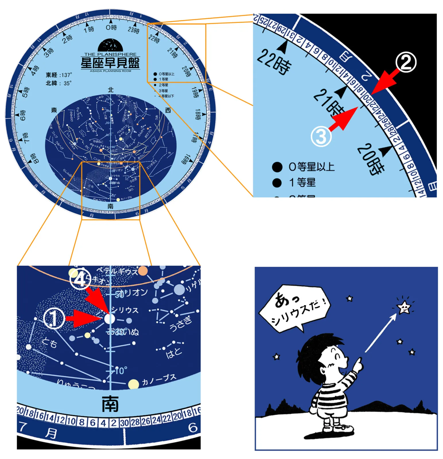 (1) 星座早見盤からお目当ての星座を選ぶ。そして選んだ星座の中からいちばん明るい星を選ぶ。例えばおおいぬ座なら1等星のシリウス。