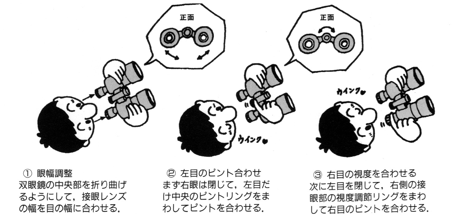 両目で双眼鏡をのぞき、双眼鏡の中央を折り曲げるようにして、左右の間隔を広くしたり狭くしたりしながら、左右の目に見える視野の円がひとつに重なるようにする。