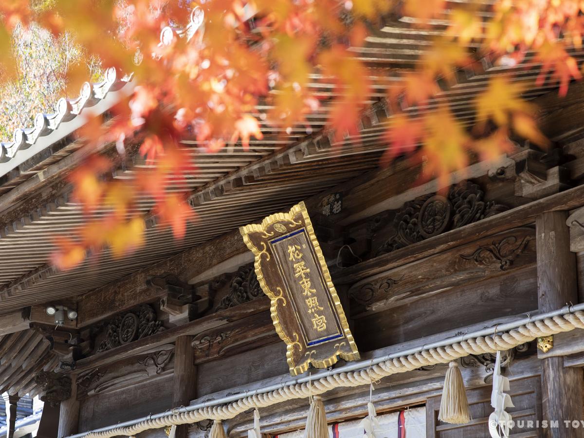 松平東照宮境內,種植著楓屬樹木與銀杏,無論是入口的銀杏、拜殿的楓葉、天下池的附近、室町塀及參道的楓葉等等,呈現秋季景觀的樹木與木造建築構成的畫面,洋溢豐富的季節風情,也是在參拜松平東照宮之餘,也值得駐足感受的自然風光。