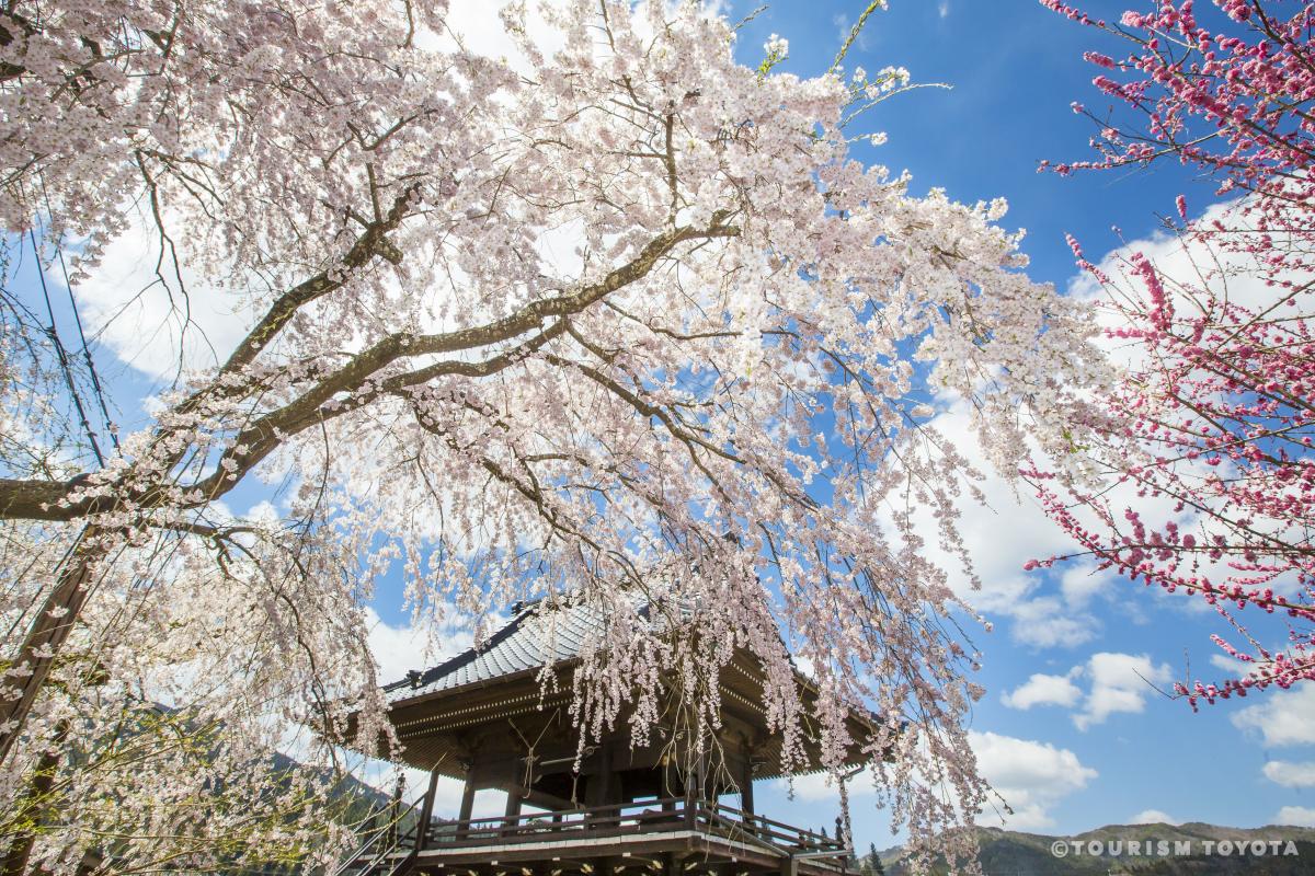 座落於豐田市稻武町的瑞龍寺,境內所擁有的一本櫻,是指定為愛知縣天然紀念物的枝垂櫻。當櫻花綻放時,花穗與與木造的寺院建築,勾勒出古色古香的秀雅風情,在藍天為襯底的對比之下,呈現具有日本傳統風情又魄力十足的畫面。若有機會前來賞櫻,也推薦夜晚前來感受點燈的一本櫻,也是受到攝影人所青睞的春日絕景。
