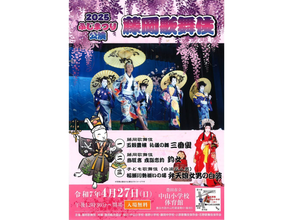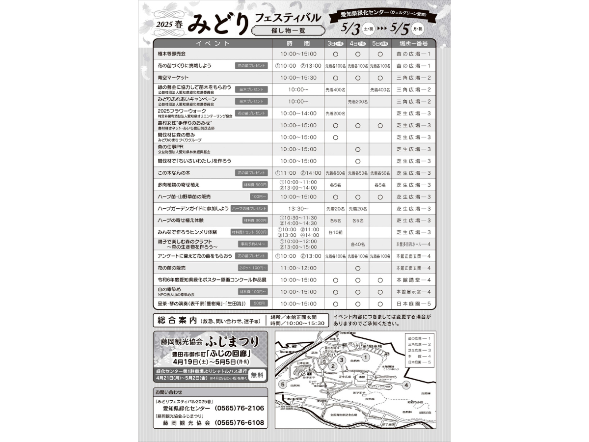 | 舉辦場所 | 【藤花節2025】藤花迴廊(4/19~5/5) 【藤花節in藤岡交流館】藤岡交流館(4/29) 【春季綠色節日’25】愛知縣綠化中心(5/3~5/5) 【藤岡歌舞伎 藤花節公演】中山小學校 體育館(4/27) |