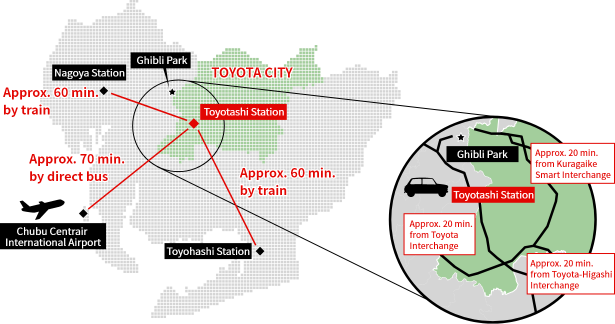 • Approx. 31 min. (25 km) from Toyota-Kanpachi Interchange on the Tokai-Kanjo Expressway.